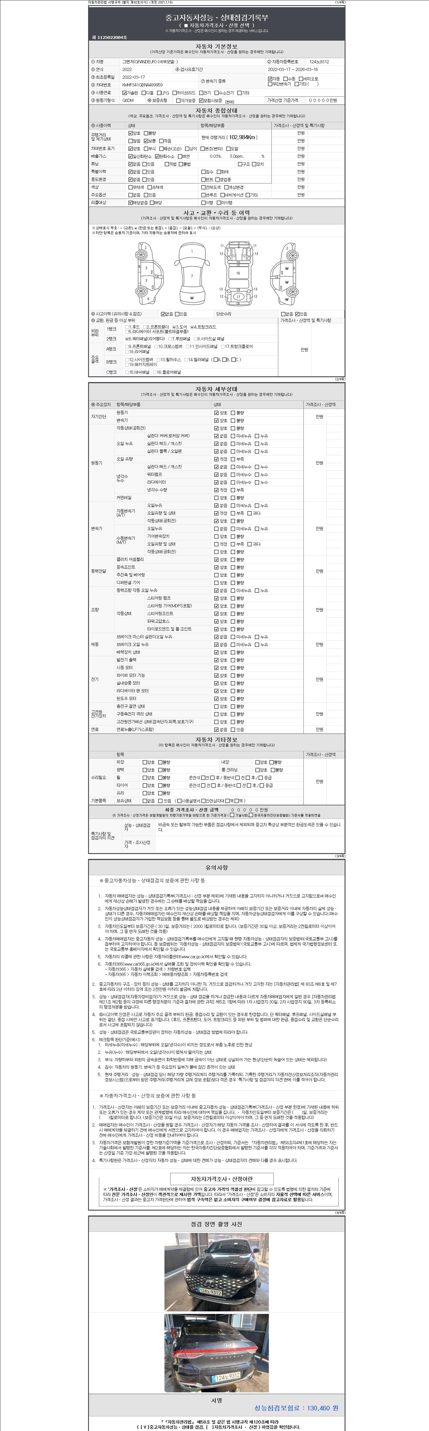 자동차관리법 시행규칙 제120조의 규정에 따라 별지 제 82호서식 《중고자동차 성능, 상태점검 기록부》를 발행한 성능, 상태점검자 및 매매자는 아래의 보증기간 또는 보증거리 이내의 중고자동차, 성능점검 기록부에 기재된 내용과 자동차의 실제 성능, 상태가 다른 경우 계약 또는 관계법령에 따라 매수인에 대하여 책임을 집니다.