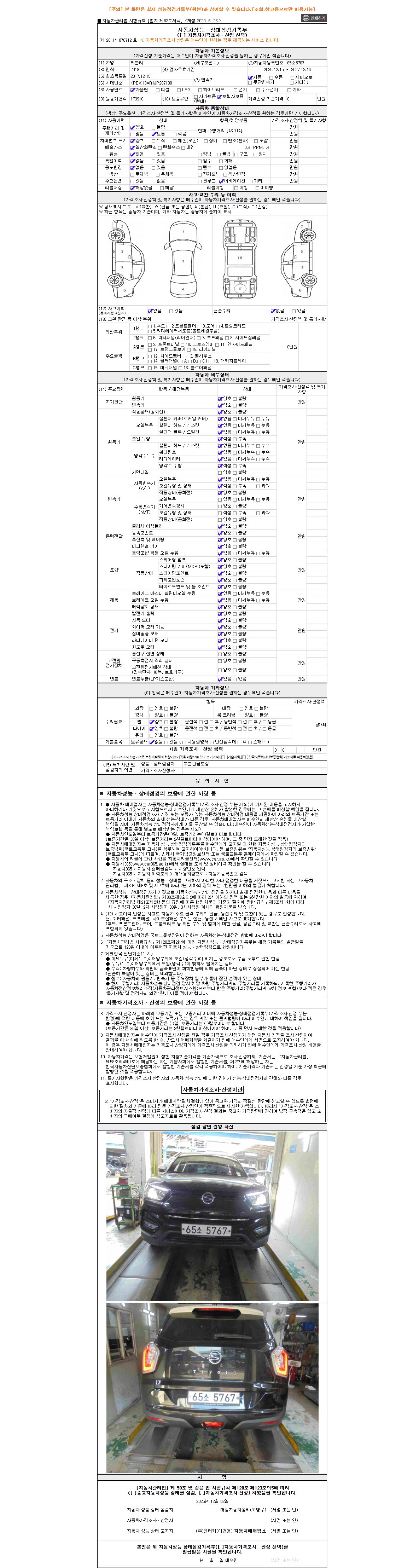 | 주행거리 | 46,714 km | 차량번호 | 65소5767 | 사고유무 | 성능기록부 참조 | 제시번호 | 제 2025163972 호 |