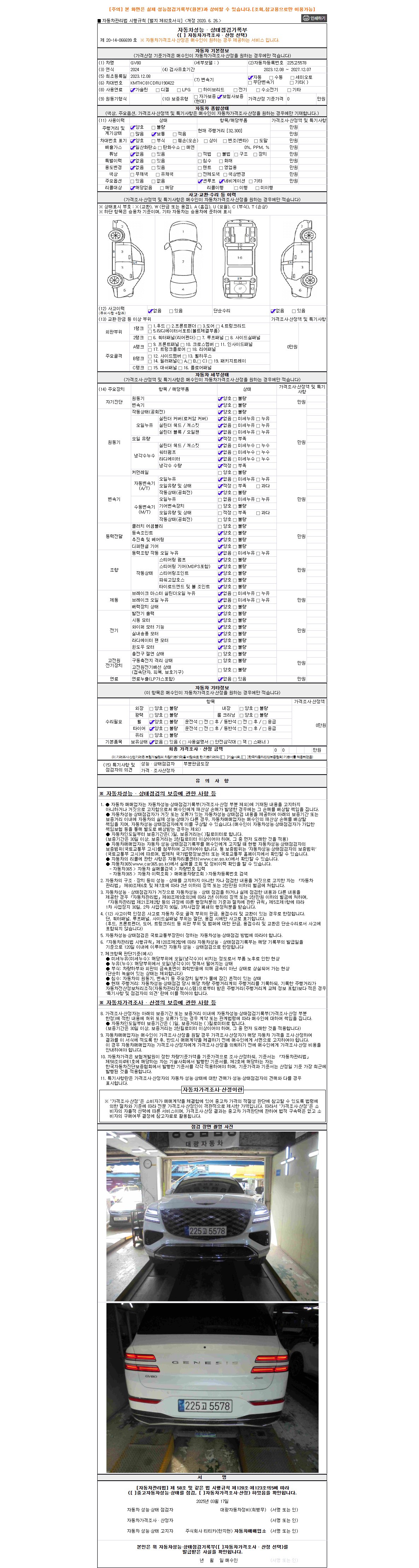 | 주행거리 | 44,652 km | 차량번호 | 225고5578 | 사고유무 | 성능기록부 참조 | 제시번호 | 제 2025032977 호 |