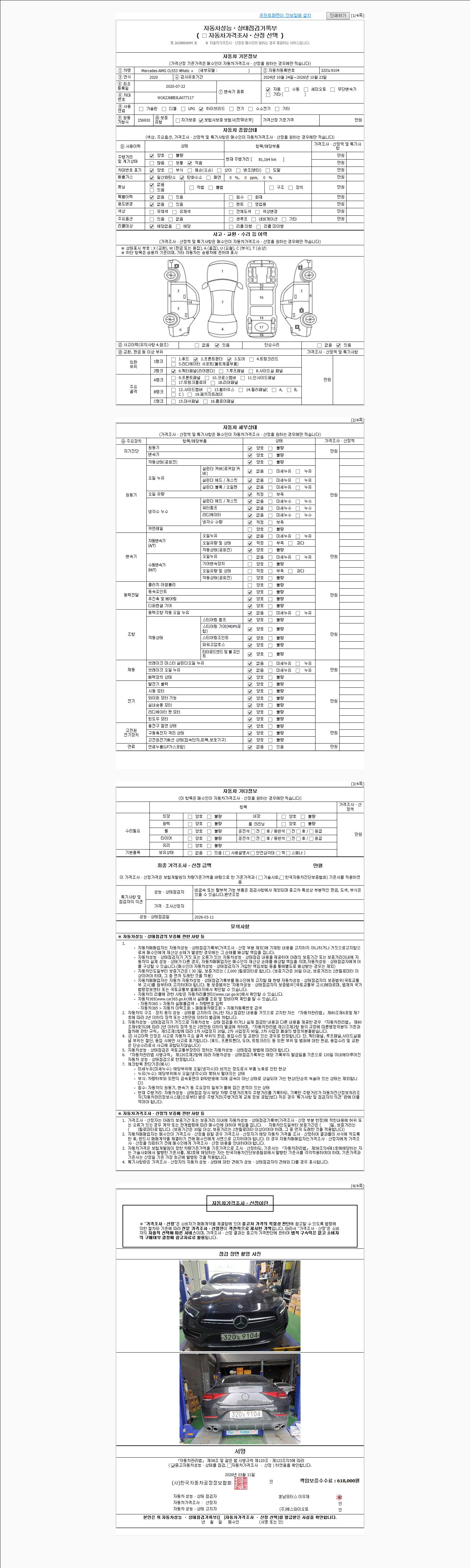 자동차관리법 시행규칙 제120조의 규정에 따라 별지 제 82호서식 《중고자동차 성능, 상태점검 기록부》를 발행한 성능, 상태점검자 및 매매자는 아래의 보증기간 또는 보증거리 이내의 중고자동차, 성능점검 기록부에 기재된 내용과 자동차의 실제 성능, 상태가 다른 경우 계약 또는 관계법령에 따라 매수인에 대하여 책임을 집니다.