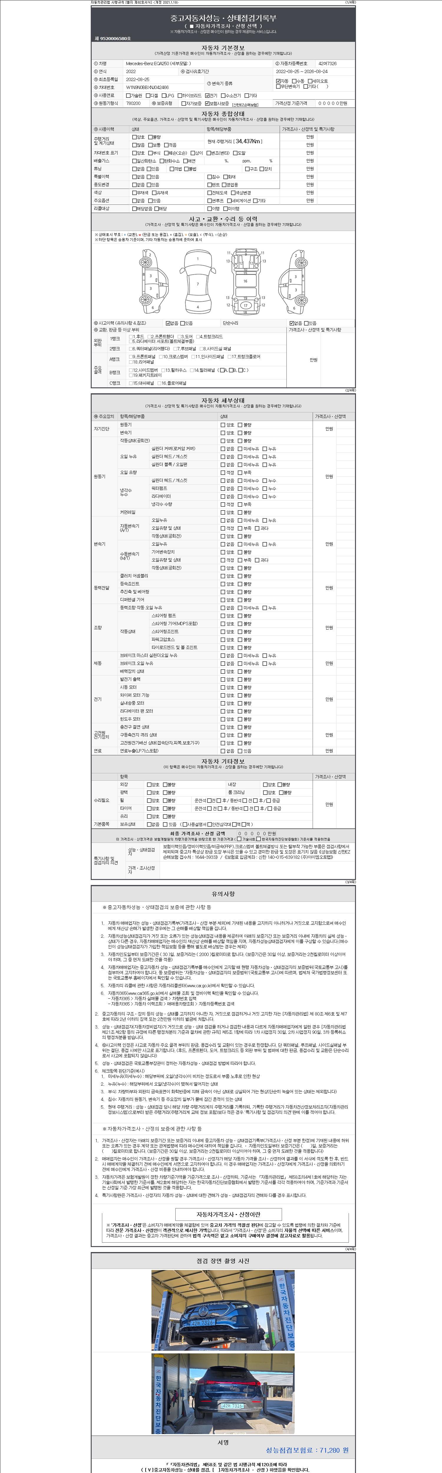 자동차관리법 시행규칙 제120조의 규정에 따라 별지 제 82호서식 《중고자동차 성능, 상태점검 기록부》를 발행한 성능, 상태점검자 및 매매자는 아래의 보증기간 또는 보증거리 이내의 중고자동차, 성능점검 기록부에 기재된 내용과 자동차의 실제 성능, 상태가 다른 경우 계약 또는 관계법령에 따라 매수인에 대하여 책임을 집니다.