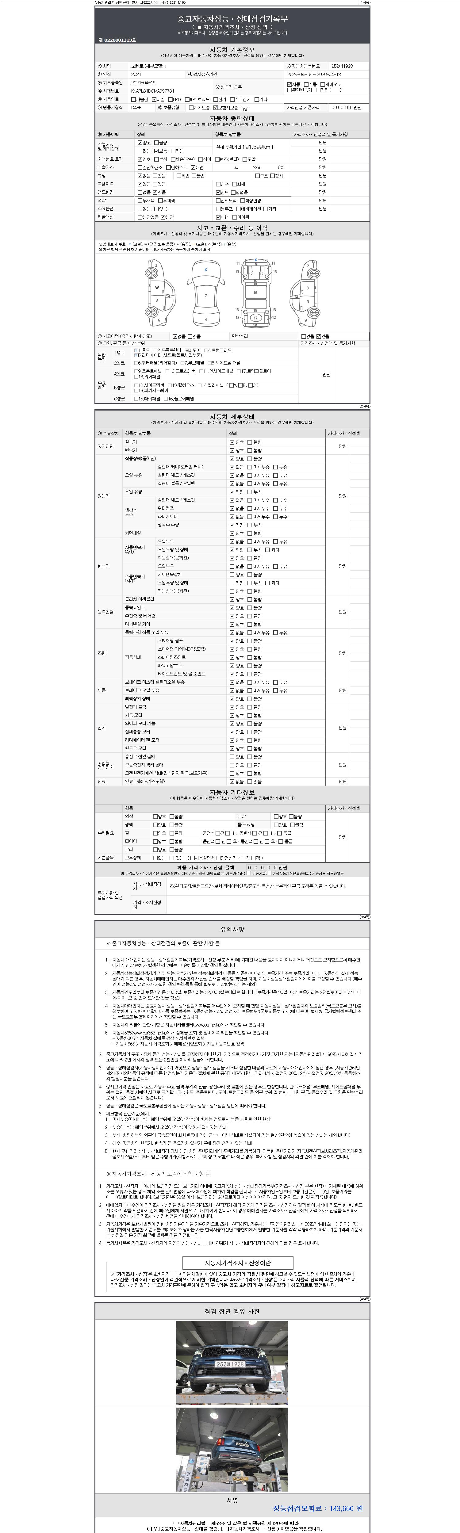 | 주행거리 | 91,399 km | 차량번호 | 252머1928 | 사고유무 | 성능기록부 참조 | 제시번호 | 제 2147483647 호 |
