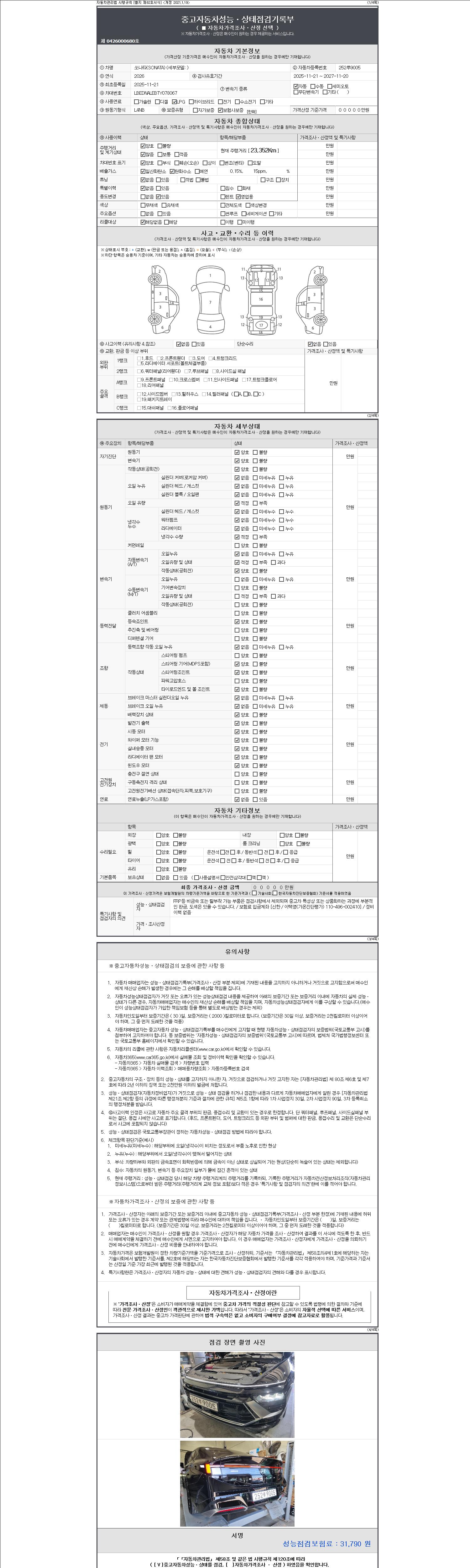 -중고자동차 매매업자를 통해 차량을 구입하실 경우 반드시 "중고자동차 성능, 상태점검 기록부"를 교뷰 받으셔야 하며, 매매업자는 반드시 의무 교부 하여야 압니다.