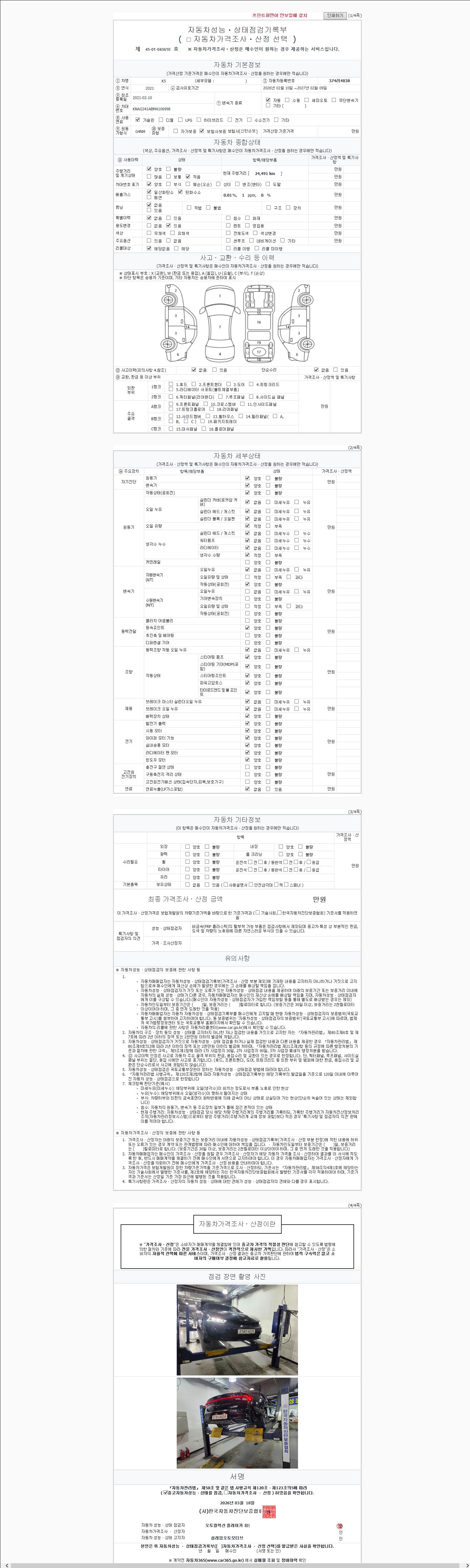 | 주행거리 | 24,491 km | 차량번호 | 374러4838 | 사고유무 | 성능기록부 참조 | 제시번호 | 제 2147483647 호 |